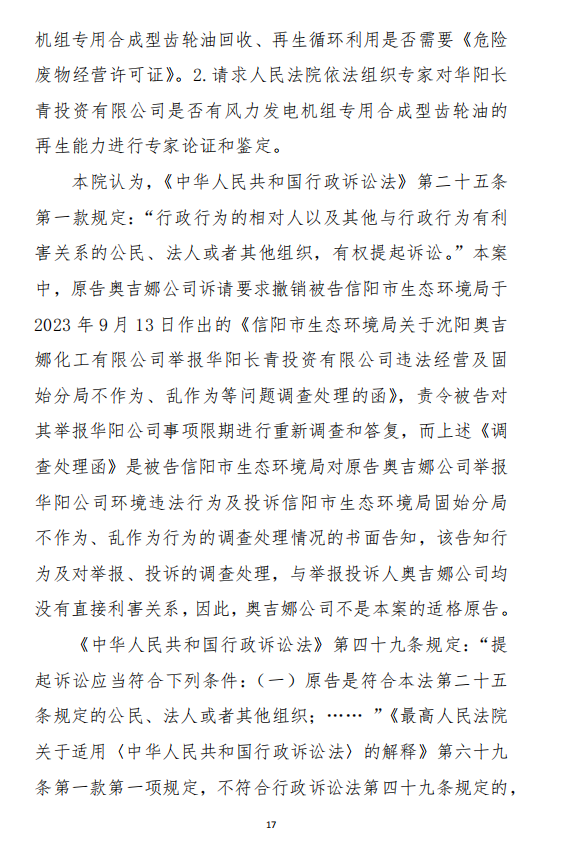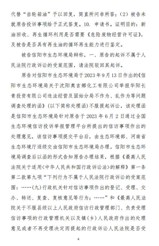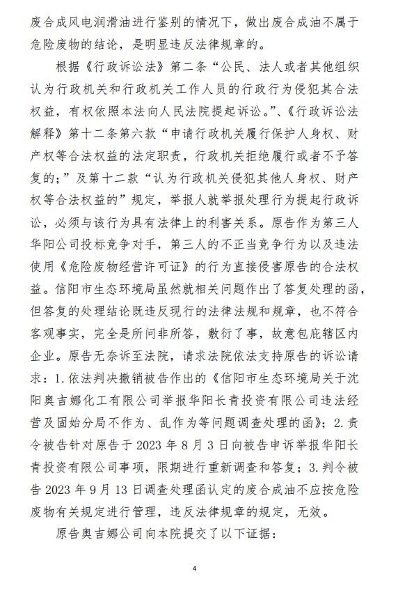 2023年10月18日,奧吉娜公司依據(jù)《行政訴訟法》和《行政訴訟法解釋》,將信陽(yáng)市環(huán)境局和第三人華陽(yáng)長(zhǎng)青公司訴至信陽(yáng)市平橋區(qū)人民法院,請(qǐng)求法院:1、判決撤銷(xiāo)被告作出的《信陽(yáng)市生態(tài)環(huán)境局關(guān)于沈陽(yáng)奧吉娜化工有限公司舉報(bào)華陽(yáng)長(zhǎng)青投資有限公司違法經(jīng)營(yíng)及固始分局不作為、亂作為等問(wèn)題調(diào)查處理的函》;2、責(zé)令被告針對(duì)原告于2023年8月3日向被告申訴舉報(bào)華陽(yáng)長(zhǎng)青投資有限公司事項(xiàng),限期進(jìn)行重新調(diào)查和答復(fù);3、請(qǐng)求人民法院判令被告2023年9月13日調(diào)查處理函認(rèn)定的廢合成油不應(yīng)按危險(xiǎn)廢物有關(guān)規(guī)定進(jìn)行管理,違反法律規(guī)章的規(guī)定,無(wú)效。