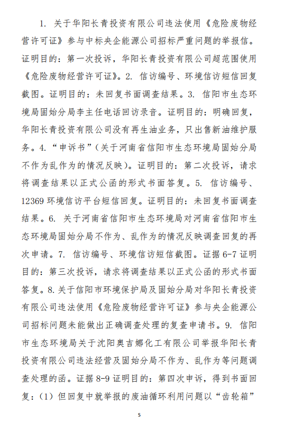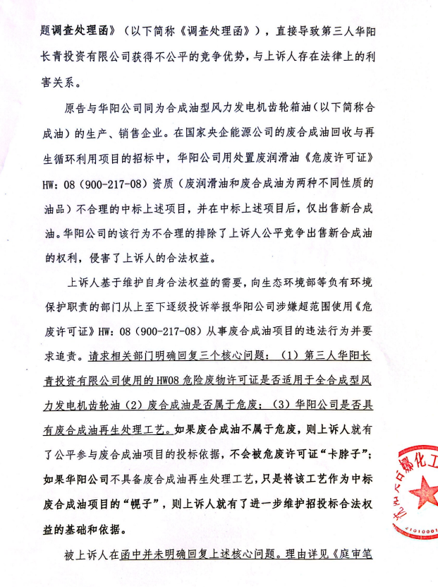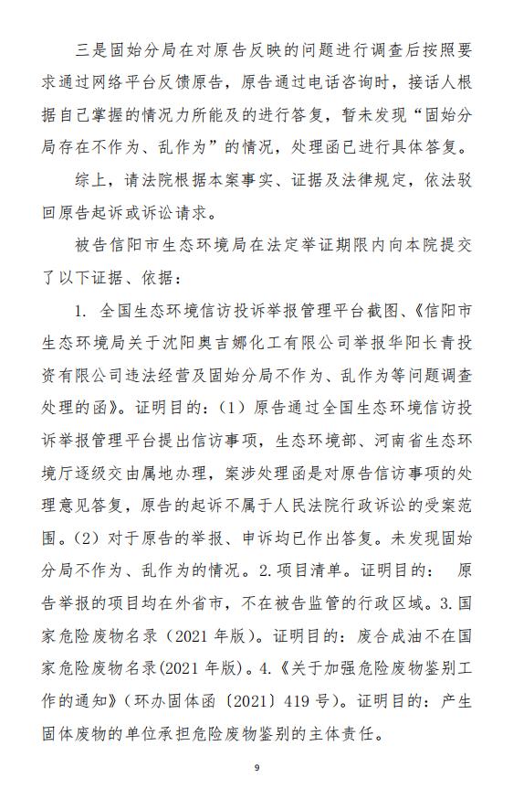 2、訴訟請(qǐng)求:請(qǐng)求人民法院判決撤銷(xiāo)被告作出的《信陽(yáng)市生態(tài)環(huán)境局關(guān)于沈陽(yáng)奧吉娜化工有限公司舉報(bào)華陽(yáng)長(zhǎng)青投資有限公司違法經(jīng)營(yíng)及固始分局不作為、亂作為等問(wèn)題調(diào)查處理的函》;責(zé)令被告對(duì)原告向被告舉報(bào)華陽(yáng)長(zhǎng)青投資有限公司事項(xiàng),限期進(jìn)行重新調(diào)查和答復(fù);判令被告認(rèn)定的廢合成油不應(yīng)按危險(xiǎn)廢物有關(guān)規(guī)定進(jìn)行管理違反法律規(guī)章規(guī)定,無(wú)效。