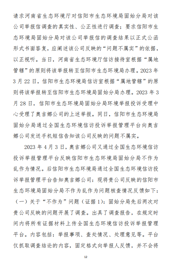 2023年6月13日,奧吉娜公司再次向環(huán)境部提出申訴,指出,奧吉娜舉報(bào)的不是許可證有效期問(wèn)題,而是許可證的適用范圍錯(cuò)誤、違法。2023年7月27日,奧吉娜公司收到回復(fù)稱,經(jīng)信陽(yáng)市生態(tài)環(huán)境局現(xiàn)場(chǎng)檢查,未發(fā)現(xiàn)固始分局不作為情況。
