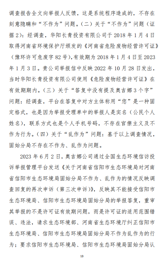 2023年9月13日,信陽(yáng)環(huán)境局向奧吉娜公司致《信陽(yáng)市生態(tài)環(huán)境局關(guān)于沈陽(yáng)奧吉娜化工有限公司舉報(bào)華陽(yáng)長(zhǎng)青投資有限公司違法經(jīng)營(yíng)及固始分局不作為、亂作為等問(wèn)題調(diào)查處理的函》。函中:一是,以“齒輪箱”替換“齒輪箱油”,偷換概念;二是,做出了廢風(fēng)電合成(齒輪)油不屬于危險(xiǎn)廢物的結(jié)論;三是,未發(fā)現(xiàn)固始分局存在不作為、亂作為的不當(dāng)行為。再次否定奧吉娜公司的舉報(bào)和投訴。