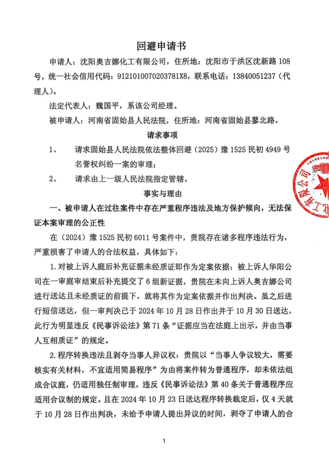 基于固始縣法院在原一審判決中存在嚴重違法行為及地方保護傾向,且奧吉娜公司已就原一審法官陳陽在該案中的相關違法行為向固始縣法院等有關部門進行舉報,但固始縣法院至今沒有將處理結果告知奧吉娜公司,奧吉娜公司認為固始縣法院無法保證該案在重新審理中的公正性,可能會繼續作出對奧吉娜公司不利的判決,奧吉娜公司于2025年6月16日依法向固始縣法院寄遞《回避申請書》,請求固始縣法院依法整體回避該案審理!(下附《回避申請書》、案由和案件過程簡述)