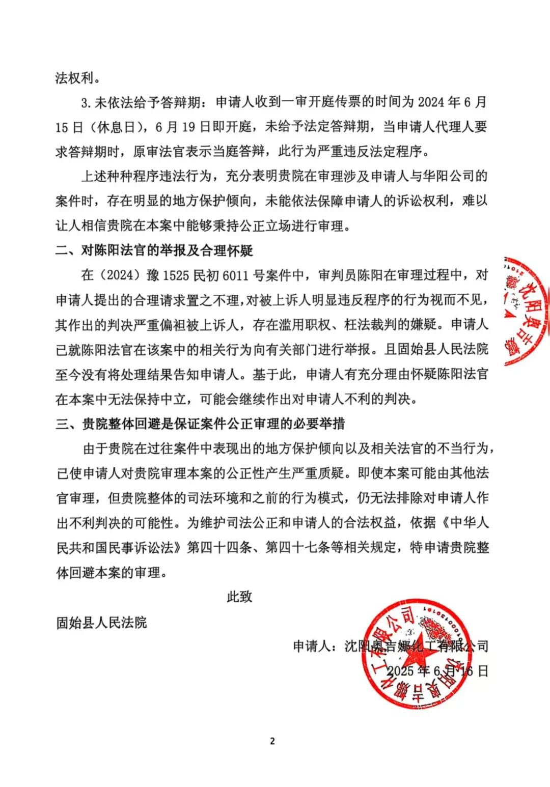 華陽長青投資有限公司訴沈陽奧吉娜化工有限公司(下稱:奧吉娜公司)舉報案侵犯名譽權糾紛案【案號:(2024)豫1525民初6011號】,因一審固始縣法院判決存在嚴重程序違法行為,信陽市中級人民法院裁定發回原審法院重審。2025年6月13日,奧吉娜公司收到固始縣法院開庭傳票【案號:(2025)豫1525民初 4949號】。
