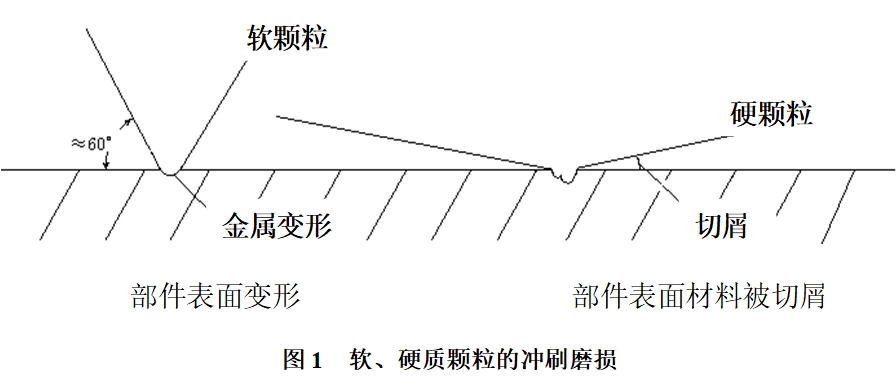 “沖蝕”磨損是指污染顆粒隨著高速流動的油液,不斷向油液系統(tǒng)中部件的表面吹射沖刷,使被沖刷部位受到磨損。污染顆粒有軟硬之分,軟質顆粒的沖蝕磨損使被沖擊部件表面變形,在表層下產(chǎn)生缺陷后損壞。硬質顆粒的沖蝕磨損使被沖刷部件表面材料晶格錯位、滑移,加劇部件疲勞或使材料表面直接被切屑剝離而形成嚴重磨損。如圖1所示。