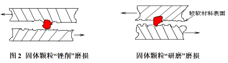 “研磨”磨損是指兩個相對運動部件的間隙中,進入與間隙尺寸相近的硬質顆粒。部件運動時,硬質顆粒與運動部件表面相接觸,像研磨劑一樣對所接觸的配合表面起著磨削作用,使配合面損傷。這種磨損是油液系統(tǒng)中主要的磨損形式。見圖2所示。