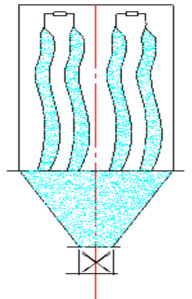 含塵氣體由進(jìn)氣口進(jìn)入灰斗或儲灰箱,通過花板孔或直接通過花板孔三種方式進(jìn)入濾袋。如圖2a、b、c所示,含塵氣體透過濾袋變?yōu)閮魵猓M(jìn)入箱體,再經(jīng)箱體上部排氣口,由風(fēng)機(jī)排走。粉塵積附在濾袋的內(nèi)表面,且不斷增加,使袋收塵器的阻力不斷上升。當(dāng)阻力上升到1500—2000Pa時為了使袋收塵器繼續(xù)工作,需定期清除濾袋上的粉塵。具體清灰時,首先關(guān)閉頂上風(fēng)機(jī),搖動電機(jī)上偏心作用,帶動連桿,使搖動軸左右來回轉(zhuǎn)動,濾袋就呈波紋狀態(tài),使粉塵掉下,卸出。清灰狀態(tài)如圖3所示。