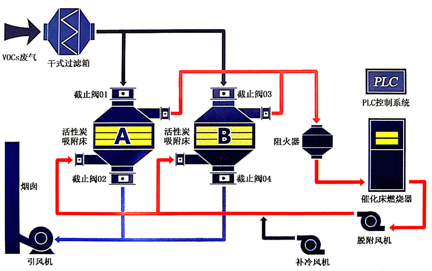 活性炭吸附/脫附催化燃燒裝置可采用吸附—催化燃燒或吸附—熱力氧化兩種工藝。此法采用新型吸附材料(蜂窩狀活性炭)吸附,在接近飽和后引入熱空氣進(jìn)行脫附、解析,脫附后廢氣引入催化燃