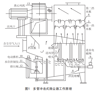 含塵氣體由入口進入箱體,經過進風管后,以較高的速度從噴口處噴出,以此來強化氣體和液體、粉塵與液體之間的相對運動,沖擊液面撞擊起大量的泡沫和水滴,最大程度的增大了氣體和流體的接觸面積,以此達到凈化空氣的目的。凈化后的空氣在負壓的作用下,通過兩道擋板由出風管排出,氣體中所含的水滴由擋板除掉。