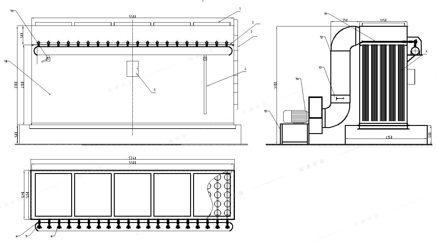 改造后,灰庫的每單臺庫頂布袋除塵器技術參數:處理風量17000m3/h、過濾風速1.0m/min、過濾面積240m2,濾袋耐溫135℃、抽塵風機出口含塵濃度≤10mg/Nm3。除塵器外型尺寸為原除塵器外殼尺寸:5.3×1.25×3.1m(高)